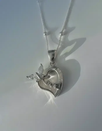 Елегантно сребърно колие с висулка във формата на сърце украсено с кристали и пеперуда . Класически сребърен дизайн с ефектен елемент от качествено сребро с родиево покритие.