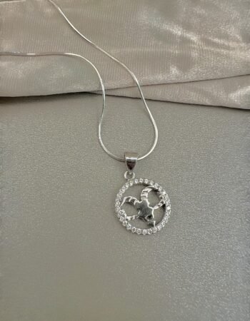 Елегантно сребърно колие със символа на зодия Овен, оформен в кръгъл медальон с фини бляскави камъни.