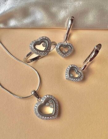 Изящен сребърен комплект – комбинация от красиво колие, обици и нежен пръстен във формата на сърца.