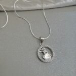 Елегантно сребърно колие със символа на зодия Водолей, оформен в кръгъл медальон с фини бляскави камъни.