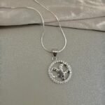 Елегантно сребърно колие със символа на зодия Овен, оформен в кръгъл медальон с фини бляскави камъни.