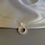 Стилно и нежно колие с циркониеви багети плюс сърце от седеф подчертани с жълта позлата.