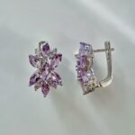 Изискани сребърни обеци, украсени с естествен аметист, фасетиран във форма маркиза – елегантна и удължена форма, която подчертава блясъка на камъка и придава аристократична визия. Лилавите аметисти са прецизно подредени в изящна флорална композиция, допълнена от фини бели камъни, които добавят светлина и дълбочина на дизайна.